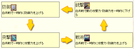 スキルは早めに覚えて積極的にのばそう。 白兵じゃんけんは早めに覚えよう。 突撃→戦術→銃撃→防御→突撃 突撃は戦術に強く、戦術は銃撃に強く、銃撃は防御に強く、防御は突撃に強い。